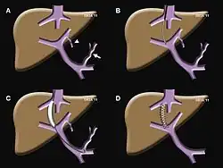 Эмболизация воротной вены (ЭВВ): доставка эмболического материала в воротную вену, питающую долю печени, содержащую опухоль(и), представляющую интерес, для стимуляции роста здоровой доли для поддержания адекватной функции печени, необходимой для проведения хирургической резекции доли, содержащей опухоль(и).[37]