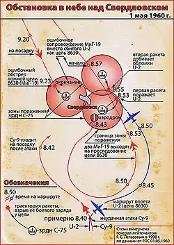 - ↑ На аэродроме Кольцово находилась также пара истребителей МиГ-19, поднятых с аэродрома вблизи Перми[18]. Однако МиГ-19 мог подняться лишь до высоты около 17 500 м[10].