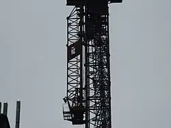 - Рассоединяют крепления лифтовой и следующей за ней промежуточной секции башни, за тем с помощью монтажной лебёдки поднимают стойку до уровня оголовка крана.