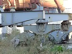 Представляет собой четырёхколёсную тележку, состоящую из двух объединённых балансиром двухколёсных тележек, одна из которых ведущая, другая — ведомая. Конструкция аналогичная типовым «унифицированным крановым тележкам». Особенность ведущей тележки состоит в том, что привод осуществляется не на два, а на одно колесо. Для снижения скорости перемещения крана используется дополнительный редуктор. Каждая тележка имеет откидные захваты по торцам и подхват в центре. Для быстрой остановки башенного крана при угоне ветром используют специальный быстродействующий захват[5].