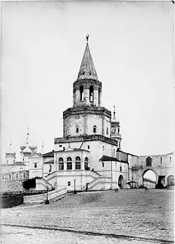 Спасская башня. Построена во второй половине XVI века псковскими зодчими Иваном Ширяем и Постником Яковлевым. С внутренней, северной стороны крепости к Спасской башне примыкала одноимённая надвратная церковь, которая к настоящему моменту стала одним целым с башней. Её типично псковский по архитектурным элементам фасад обращен на главную улицу кремля. В конце XVII века вместо 3 яруса башня была надстроена двумя кирпичными 8-гранными ярусами с кирпичным же шатром, получив свой нынешний, привычный казанцам облик. Перед башней до середины XIX века был ров с каменным мостом. В 1905 году внешняя военная часовня (при надвратной церковью во имя Спаса Нерукотворного) была перестроена; она была уничтожена советской властью в конце 1920-х для сквозного проезда через башню[4][5]. До 1917 года башню венчал двуглавый герб Российского государства, в верхнем ярусе в XVIII веке были установлены часы «со звоном» и ещё ранее перенесен из небольшой звонницы (ныне утраченной, находившейся на прясле стены по левую сторону башни) большой набатный колокол. |