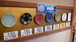 Цена каждой порции определяется по цвету тарелки, в которой это блюдо ходит по конвейеру. Как правило, это фиксированный набор цен, например, 150, 200, 500 йен. В некоторых ресторанах все порции имеют одинаковую цену в 100 йен.