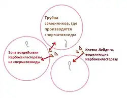 В семенниках карбоксилэстераза участвует в биосинтезе тестостерона и защищает клетки Лейдига от воздействия повреждающих и токсических агентов.
