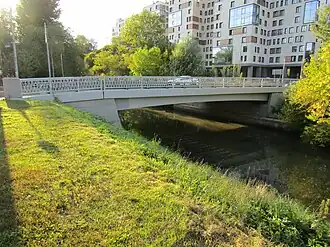 Мост однопролётный сталежелезобетонный балочный. Пролётное строение состоит из 12 главных балок двутаврового сечения, объединённых поперечными связями и монолитной железобетонной плитой проезжей части[5]. Расчётный пролёт — 20,4 м. Фасадные балки имеют криволинейное очертание нижнего пояса (от 0,97 м в середине пролёта до 1,338 м на устоях), остальные балки – постоянной высоты (0,97 м)[5]. Устои из монолитного железобетона, на свайном основании. Устои имеют крылья длиной по 6,1 м. Со стороны левого берега Черной речки крылья очерчены по кривой, на правом берегу крылья прямолинейные. Полная длина моста составляет 33,1 м (21,0 м — по задним граням устоев), ширина моста — 13 м[4][3].