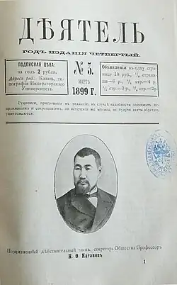 Менее чем через 2 месяца после прибытия в Казань Николай Фёдорович Катанов был избран секретарём Общества археологии, истории и этнографии — ОАИЭ — при университете (8 апреля 1894 года)[48]. И здесь Катанов активно занимался всем: привёл в порядок библиотеку Общества, стал редактировать его «Известия» и впервые стал публиковать там отчёты Общества и протоколы его заседаний. Из-за невозможности совмещения преподавания и занятий Обществом Катанов в 1897 году попросил освободить его от обязанностей секретаря, но уже в 1898 году был избран председателем ОАИЭ[49]. Отношения с коллегам по Обществу не всегда складывались легко, 19 марта 1900 года он не без раздражения писал В. В. Радлову: