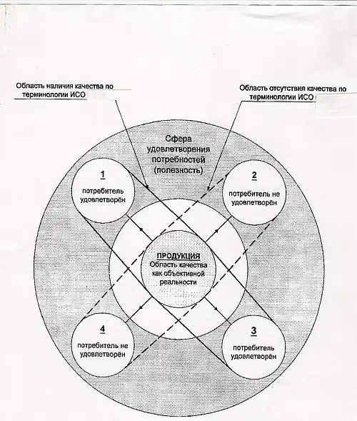 Соглашаясь с приведёнными в стандартах определениями качества, что один и тот же предмет в одно и то же время может и обладать качеством, и не иметь его вовсе в зависимости от удовлетворения потребителей. Наглядно это показано следующим образом.