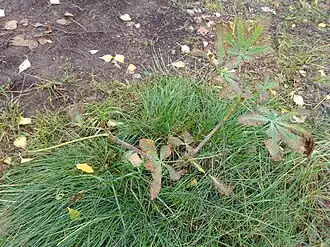 Слева направо: саженец каштана в середине мая; рыжие разводы на листьях от поражения грибком, появились через 2 месяца (на фото саженец, ослабленный действием дефолианта); саженец в середине августа, листья опадают, приобретя бурый цвет | ||||||||||