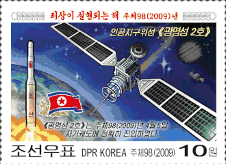 Почтовая марка КНДР по случаю запуска РН «Ынха-2» с ИСЗ «Кванмёнсон-2»