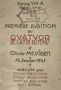 В течение следующего года Мессиан смог написать квартет для этих инструментов благодаря помощи охранников, особенно Карла-Альберта Брюля, который обеспечивал Мессиана нотной бумагой и карандашами[2]. Мессиан с коллегами представили завершённый квартет перед полной лагерной аудиторией 15 января 1941 года[3].