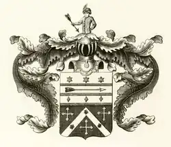 На щите дворянский коронованный шлем. Нашлемник: выходящий человек, имеющий на голове зелёную чалму с перьями, а в правой руке — стрелу, острием вниз обращенную. Намёт на щите голубой, подложенный серебром (Гербовник, III, 113).