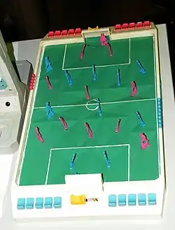 Патенты на аналогичные настольные игры появились в Европе еще в 1890-х годах. Однако истоки настольного футбола восходят к 1921 году, когда Гарольд Сирлс Торнтон из Соединенного Королевства запатентовал игру как «Устройство для игры в настольный футбол».[1][2]