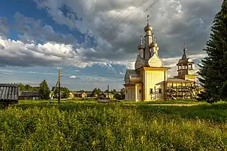 - Пятиглавая деревянная шатровая Одигитриевская церковь 1709 года постройки[22]. Всего в деревне было три церкви, так как здесь селились раскольники, выстраивавшие свои слободы. Поселенцы Матрёниной слободы называли себя «старообрядцами», а жителей другой — «староверами». Одигитрия оставалась православной.
