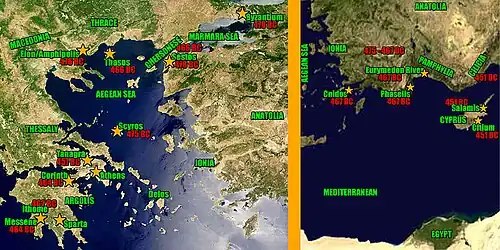 После окончательного изгнания персов с территории Греции Кимон был назначен афинским стратегом в составе союзного флота под общим руководством спартанского царя Павсания[29][30][31]. Во время экспедиции греки захватили у персов Византий. Несмотря на военные успехи, спартанский царь Павсаний из-за своей грубости и недостойного поведения лишился поддержки рядовых греков[30].