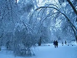 Чаще всего оттепели случаются в первой половине зимы (в этом случае они нередко являются продолжением поздней осени). Погода часто неустойчива (например, среднесуточная температура всего за 2—3 дня может упасть с −5 до −20 °C и затем примерно за такой же срок вновь подняться до −5 °C), но в отличие от других сезонов, суточные колебания температуры зимой невелики — из-за преобладания пасмурной погоды разница между дневной и ночной температурами обычно не превышает 5 °C (в отличие от «летних» 10—12). В XXI веке зимы стали заметно теплее, чем до 1970—1980 годов. К примеру, среднемесячная температура января 2020 года впервые в истории наблюдений оказалась положительной (+0,1 °C)[11]. Минимальная температура того января составила необычные для Москвы −6,8 °C, что является самым высоким минимумом января. При этом предшествующий ему декабрь 2019 года был ещё теплее со среднемесячной температурой +0,8 °C и минимальной всего −5,2 °C, что также является самым высоким минимумом декабря[12]. В 2025 году рекорд 2020 года по среднемесячной температуре января (+0,1 °C) был повторён[13]. Кроме того, в XXI веке были зафиксированы случаи, когда в Москве снежный покров полностью сходил в середине января; например, в 2007 году[14], 18 января 2020 года, а также 11 и 18 января 2025 года[15][16][17].