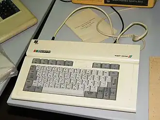 Имеет встроенный контроллер дисковода (реализован на микросхеме КР1818ВГ93). Необычной особенностью его конструкции является активное использование микросхем в планарных корпусах. Имеет поддержку русского языка в интерпретаторе Бейсика и в операционной системе TR-DOS[30]. | |
