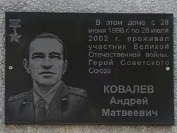 - ↑ Мемориальная доска Ковалёву Андрею Матвеевичу. Сайт архиват.рф. Дата обращения: 8 июля 2015. Архивировано из оригинала 10 августа 2016 года.