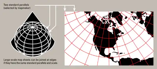 В конической проекции изображение строится на боковой поверхности конуса, секущего земной шар по двум параллелям или касательного к нему. Вершина конуса лежит на продолжении земной оси.