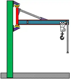 Кран состоит из плоской фермы, верхней и нижней опор и тали. Опоры с помощью кронштейнов прикреплены к стене здания; нижняя опора может опираться на выступ здания. Угол поворота ограничен подходами к стене. Вращение крана осуществляют вручную на канат или механизмом поворота. Подкос фермы выполнен из двутавра (в соответствии с грузоподъёмностью тали). Кронштейн верхней опоры колонны прикрепляют к стене болтами, которые должны быть затянуты таким образом, чтобы под нагрузкой не произошло раскрытия стыка. Кронштейн нижней опоры удерживается силой трения[1].