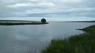 Лучегорское водохранилище на реке Контровод.На заднем плане — посёлок Лучегорск