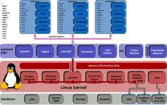- косвенно через другие программные средства, использующие контрольные группы, например, через системы контейнеризации LXC[9] и Docker, библиотеку libvirt, технологию инициализации systemd, кластерное управляющее программное обеспечение Grid Engine[10].