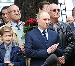 Андрей Кончаловский с младшим сыном Петром, Президент России Владимир Путин, Никита Михалков на церемонии открытия памятника С. В. Михалкову,