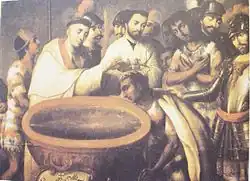Первой целью Кортеса стало горное княжество Тласкала, постоянно враждующее с государствами Тройственного союза (собственно ацтеками). Кортес располагал 300 пехотинцами, 15 всадниками и около 1300 тотонакскими воинами и носильщиками — испанцы шли налегке[56]. На земле Тласкалы пришлось выдержать бой с аборигенами, причём тласкаланцы убили двух лошадей. Вскоре вожди тласкаланцев договорились между собой, и 3 октября Кортес был торжественно принят в городе. Шёл 24-й день похода[57]. Верховный вождь тласкаланцев Шикотенкатль и другие правители подарили испанцам своих дочерей, чтобы «слиться со столь храбрыми и добрыми людьми»[58]. Кортес связал этот акт с христианизацией, после чего одна из пирамид Тласкалы была очищена от «идолов», освящена, и тласкаланки приняли там крещение. Дочь Шикотенкатля была наречена Луисой де Тласкала, и Кортес лично вручил её Педро де Альварадо, назвав его своим младшим братом. Тласкаланки достались также Хуану Веласкесу де Леону, Гонсало де Сандовалю и другим[59]. Хронисты также утверждали, что Кортесу удалось окрестить четверых вождей Тласкалы, но в собственных его посланиях об этом не упоминается[60].