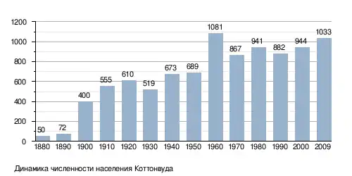 Согласно оценочным данным за 2008 год, население Коттонвуда составляло 1 041 человек[2] Плотность населения равна 495,71 чел./км². Средний возраст населения — 39 лет и 1 месяц. Половой состав населения: 48,5 % — мужчины, 51,5 % — женщины. В 2000 году насчитывалось 364 домашних хозяйств и 242 семейств. Расовый состав населения по состоянию на 2000 год:[8]