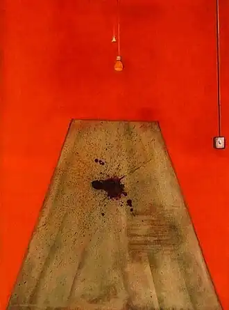 Большой масштаб картины акцентирует лужу крови и придаёт ей первостепенное значение в работе. Выключатель света и лампочки служат лишь для освещения брызг крови. В композиции отсутствует даже какой-либо намёк на «владельца» этой крови или хотя бы объяснение того, как она попала туда. По мнению искусствоведа Джозефа Харриса сама кровь становится субъектом портрета[5].