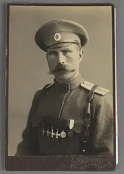 С началом Первой Мировой войны был мобилизован в ряды действующей русской армии. За период нахождения в рядовых и унтер-офицерских чинах был награждён всеми 4-мя степенями Георгиевского креста, Георгиевской медалью 4-й степени и французской медалью «За мужество и самоотверженность». За проявленные успехи на поле боя в 1915 году был повышен до прапорщика и назначен командиром первой роты 3-го Финляндского стрелкового полка.[1] В период войны был неоднократно контужен. За боевые отличия награждён орденами Святой Анны 4-й, 3-й и 2-й степени, Святого Станислава 3-й и 2-й степеней и Святого Владимира 4-й степени. К 1917 году дослужился до поручика.