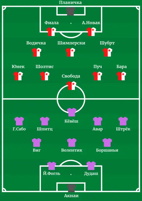 | «Славия» Прага: Планичка - Женишек, А.Новак - Водичка, Шимперски, Кёниг - Юнек, Шолтис, Свобода, Пуч, Кратохвил »: Хорешовски - Райнер, Й.Блюм - Каллер, Л.Хофманн, Маху - Брозенбауэр, Адельбрехт, Гшвайдль, Тёгель, Гибиш |
