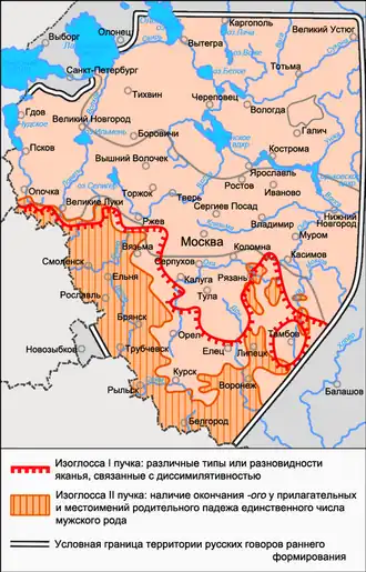 - Произношение окончаний род. падежа -его, -ого через фрикативное /ɣ/, а не через /в/.