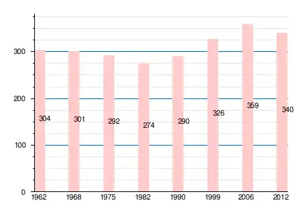 | 1962 | 1968 | 1975 | 1982 | 1990 | 1999 | 2004 | 2006 | 2009 | 2011 | 2012 |