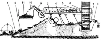 Двухсекционный плоский лемех 1 с активными боковинами подкапывает грядку и подаёт пласт на основной прутковый элеватор 2. Для более интенсивной сепарации в элеватор встроен механизм принудительного встряхивания с регулируемой амплитудой. Клубни с ботвой и оставшейся почвой проходят между пневматическими баллонами 3, разрушающими комки, и поступают на двухрешётный грохот 4, на котором отделяется почва. С грохота масса поступает на транспортёр 5 с пневматическими баллонами 4 и далее через разреженный прутковый транспортёр 7 на сепарирующий элеватор 6. Оттуда оставшиеся почва и клубни попадают в барабанный транспортёр 10, а ботва и растительные примеси захватываются прутками транспортёра ботвоудаляющего устройства. При прохождении ботвы между прижимным транспортёром 9 и отбойным валиком 8 имеющиеся на ботве клубни обрываются и поступают также в барабан. Барабанный транспортёр массу на наклонный транспортёр-переборщик 11, который частично разделяет клубни и примеси. Стоящие по бокам рабочие отбирают из потока клубней примеси, а из потока примесей клубни. Примеси с переборщика поступают на поперечный ленточный транспортёр 13 и выносятся им из комбайна на поле. Чисты промежуточным транспортёром 12 подаются в накопительный транспортёр. Из него картофель прямо на ходу поступает в транспорт, едущий рядом.