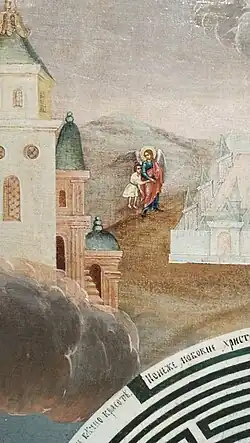 В своём движении вверх к Небесному Иерусалиму душа может прочесть имеющиеся на иконе надписи: «Яко на пути в нынешнем пребывая животе да со Христом будеши вечно красоте» и «Брате, словесем врага не веруй твоего. Дондеже прейдет скорый бег жития сего»[5]. Вверху выходов из лабиринта два. Путника встречает надпись: «Понеже любовне Христос призывает и райские врата усердно отверзает». В верхней части иконы находится изображение самого Небесного Иерусалима с двенадцатью воротами, а также чистые души, их провожают к Небесному Городу двое ангелов. Над Небесным Иерусалимом в облаках, которые играют роль картуша[1], находится изображение Деисуса[6][1]. Богородица и Иоанн Предтеча обращаются к Господу с просьбой о спасении рода человеческого. Над Небесным Иерусалимом под Деисусом парит Дух Святой в образе голубя[4].