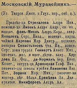 - ↑ А. С. Суворин. Вся Москва. — VII год издания. — Москва: Товарищество А. С. Суворина — „Новое время“, 1900. — С. 141.