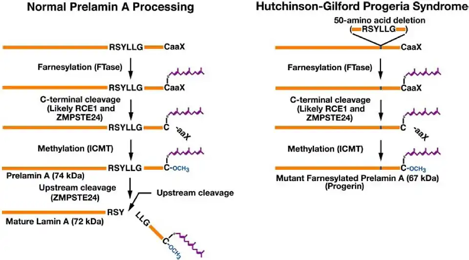 Ламин A образуется не сразу, а путём процессинга неактивного прекурсора преламина A.[2]