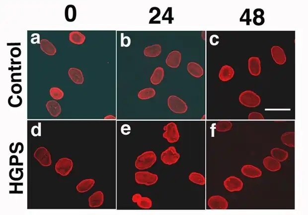 - 1 2 Paradisi M., McClintock D., Boguslavsky R.L., Pedicelli C., Worman H.J., Djabali K. Dermal fibroblasts in Hutchinson-Gilford progeria syndrome with the lamin A G608G mutation have dysmorphic nuclei and are hypersensitive to heat stress (англ.) // BMC Cell Biol. : journal. — 2005. — Vol. 6. — P. 27. — doi:10.1186/1471-2121-6-27. — PMID 15982412. — PMC 1183198. Архивировано 17 сентября 2009 года.