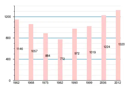 | 1962 | 1968 | 1975 | 1982 | 1990 | 1999 | 2005 | 2006 | 2010 | 2011 | 2012 |