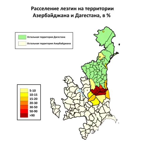 В Азербайджане лезгинское население, в основном, сосредоточено в Гусарском (79,6 тыс., перепись 2009 г.), Губинском (9,0 тыс., перепись 2009 г.), Хачмазском (22,7 тыс., перепись 2009 г.), Габалинском (16,0 тыс., перепись 2009 г.), Исмаиллинском (7,1 тыс., перепись 2009 г.), Огузском (4,8 тыс., перепись 2009 г.), Шекинском (6,2 тыс., перепись 2009 г.) и Кахском (0,3 тыс.) районах и во всех крупных городах — в особенности, в Баку (24,9 тыс., перепись 2009 г.). По мнению экспертов Института этнологии и антропологии РАН и Института истории, археологии и антропологии ДНЦ РАН, «в Азербайджане число лезгин значительно выше (около 350 тыс. человек). Объясняется это расхождение тем обстоятельством, что многие лезгины, живущие в Азербайджане, фиксируются как азербайджанцы»[6].