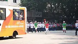 В итоговый шорт-лист в сентябре 2009 года были выбраны два дизайна факелов для эстафеты Азиады. Факел под названием «Прилив»(潮流, также «Морская волна») был выбран организаторами в качества факела Игр, опередив дизайн «Подвиг»[23].