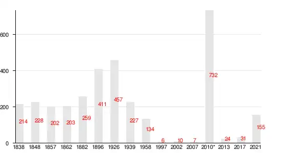 | 1838 | 1848 | 1862[35] | 1896 | 1926 | 1939 | 1958[36] |