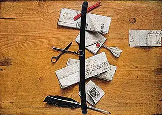 Набор предметов, изображённый на полотне, по мнению искусствоведов, должен интерпретироваться как «всё, что понравится». Случайное собрание сложенных бумаг, тетрадей и других принадлежностей для переписки, закреплённых на стене, стало одной из любимых тем обманок в 1650 году. В XVII веке было принято прикреплять на стену несколько досок пихты, на такую панель прибивали ленту или ремень и использовали для хранения на видном месте писем, документов, рисунков и других подобных предметов. Эта композиция была для художников способом продемонстрировать свою виртуозность в создании обманок[8].