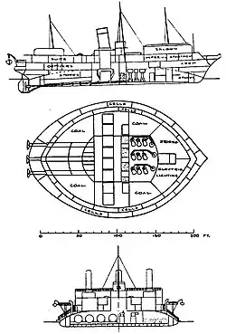 | Двигатели | 3 вертикальные паровые машины двойного расширения; 8 котлов, 2 полукотла |