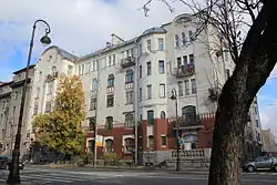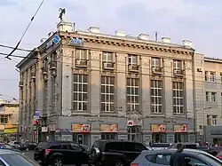 1913—1915 Здание Русского для внешней торговли банка Киев, ул. Крещатик, д. № 32 Здание пострадало от огня в 1941 году, восстановлено в 1950 году с внутренней перепланировкой[18][19]