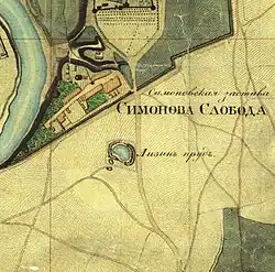 ![]() Вид Симонова монастыря со стороны Лизиного пруда. Литография с оригинала К. Рабуса (1840-е) | |