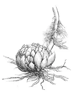 Луковица состоит из двадцати-тридцати перекрывающихся между собой чешуек и не защищена дополнительной внешней оболочкой. Она достигает диаметра 2,5—4,5 см. Форма сжатая, корневищная; луковица покрыта порами и имеет тенденцию к распаду. Чешуя белая, узколанцетная. Чешуйки разделены на два или три сегмента.