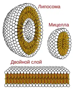 Все живые клетки окружены плазматическими мембранами, основным структурным элементом которых является двойной слой липидов (липидный бислой). На 1 мкм² биологической мембраны находится около миллиона молекул липидов[7]. Все липиды, входящие в состав мембран, имеют амфифильные свойства: они состоят из гидрофильной и гидрофобной частей. В водной среде такие молекулы спонтанно образуют мицеллы и бислои в результате гидрофобных взаимодействий, в таких структурах полярные головы молекул обращены наружу к водной фазе, а неполярные хвосты — внутрь, такое же размещение липидов характерно для естественных мембран. Наличие гидрофобного слоя очень важно для выполнения мембранами их функций, поскольку он непроницаем для ионов и полярных соединений[6].
