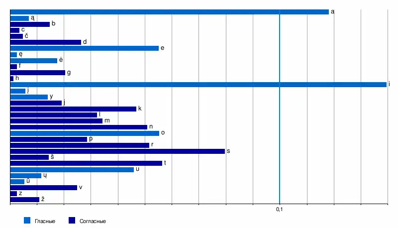Частотность букв литовского языка на материале 9 связных текстов большого объёма на литературном литовском языке[14]: