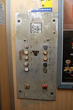 - Кабина. Перевозит пассажиров и/или другие грузы. Снаружи кабины расположены направляющие башмаки, скользящие по направляющим шахты при движении кабины и поддерживающие кабину в вертикальном положении, ловители для аварийной остановки лифта[11], отводка для воздействия на этажные переключатели при подходе к нужному этажу[12]:77—78, либо магнитный шунт для воздействия на этажный датчики селекции. У двухскоростных лифтов или лифтов с регулируемой скоростью привода на кабине установлен индукционный либо герконовый датчик точной остановки, который взаимодействует с магнитными шунтами на каждом этаже. К кабине сверху напрямую или через полиспаст с блоком прикреплены рабочие канаты подвески. У выжимного лифта канаты подвески проходят через шкивы, закреплённые под кабиной. На кабине с автоматическим дверями установлен привод дверей, отпирающий замки двери шахты и раскрывающий двери. Двери шахты собственного привода не имеют. У лифтов с распашными дверями на кабине установлена отводка, отпирающая замок двери шахты в точной остановке. Часто устанавливается электромагнит, убирающий «лыжу» отводки в движении — магнитная отводка.