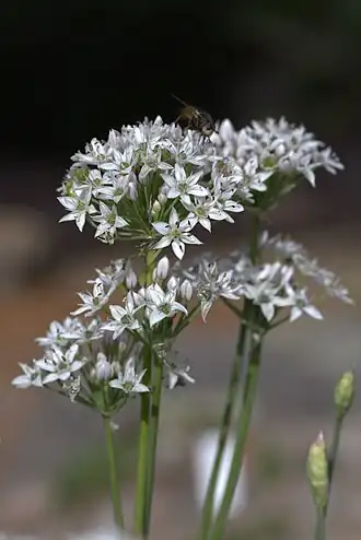 Зонтик пучковатый или пучковато-полушаровидный, обычно многоцветковый, густой/ Листочки колокольчатого околоцветника белые, бледно-розовые, розовые или розово-фиолетовые, длиной 7—14 мм, равные, реже наружные на четверть короче, линейно-ланцетные, ланцетные или продолговато-ланцетные, оттянутые, острые. Нити тычинок в полтора—два раза короче листочков околоцветника, на треть или на половину между собой и с околоцветником сросшиеся, цельные, наружные треугольно-шиловидные, внутренние треугольные; пыльники жёлтые. Столбик не выдается из околоцветника.